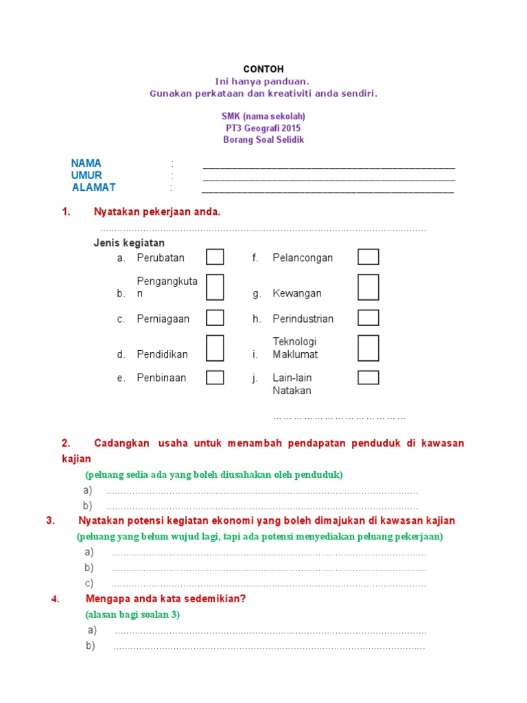 Contoh rasmi borang soal selidik tugasan geografi pt3 2015 kegiatan ekonomi. Tajuk kajian 'guna tanah di kawasan kajian anda' telah dipilih sebagai tugasan yang wajib disiapkan oleh setiap calon pt3 pada tahun 2018. Di mana ia merupakan sebahagian. Di bawah ini adalah contoh borang soal selidik sejarah pt3 2016 yang boleh anda jadikan sebagai skrip ketika melakukan temubual kelak. Contoh borang soal selidik geografi pt3 tugasan 2021 bagi pelajar tingkatan 3 :