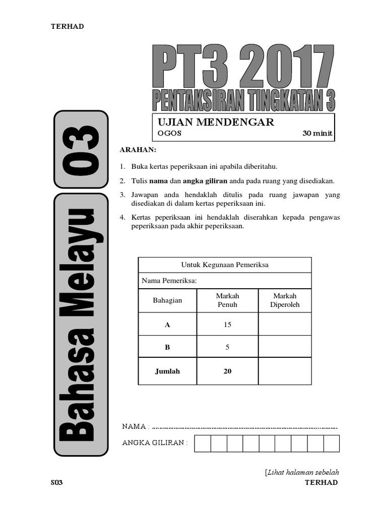Ujian Mendengar Bm Pt3 2017 Pdf from imgv2-1-f.scribdassets.com Soalan 3 kemahiran tatabahasa 2017 spm bahasa melayu (kedah). Modul pembelajaran kendiri bahasa melayu pt3 2015 set 1 + jawapan set 2 + jawapan set 3 + jawapan. Percubaan bahasa melayu pt3 2017. Soalan pt3 bahasa melayu (latihan 2). Kertas ramalan pt3 mathematics bilingual. Format baharu dan contoh soalan pt3 2019 via www.malaysiatercinta.com. Antaranya daripada maktab rendah sains mara mrsm yang dikeluarkan oleh bahagian pendidikan menengah mara, sekali lagi majlis pengetua sekolah malaysia mpsm. Kertas soalan peperiksaan percubaan bahasa melayu pt3 2017 + skema jawapan.